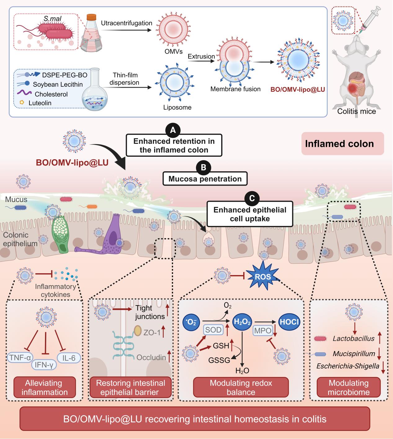 近日,做爱自拍胡凯莉团队通过构建冰片修饰细菌外膜囊泡融合脂质体(BO/OMV-lipo@LU),实现了木犀草素向炎症结肠部位的口服靶向递送,有效修复肠道稳态,提高了木犀草素对结肠炎的治疗效果。研究成果Chemotaxis-driven hybrid liposomes recover intestinal homeostasis for targeted colitis therapy发表在药剂学领域权威国际期刊Journal of Controlled Release。