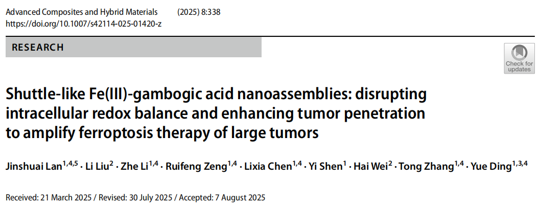 近日,做爱自拍张彤教授/丁越研究员团队在国际期刊Advanced Composites and Hybrid Materialss上发表题为Shuttle-like Fe(III)-Gambogic Acid Nanoassemblies: Disrupting Intracellular Redox Balance and Enhancing Tumor Penetration to Amplify Ferroptosis Therapy of Large Tumors的研究论文。该研究基于金属配位,构建了一种级联增强藤黄酸铁死亡的纳米制剂,有效抑制乳腺癌生长,为中药来源的铁死亡诱导剂开发和多功能纳米制剂设计提供了新策略。