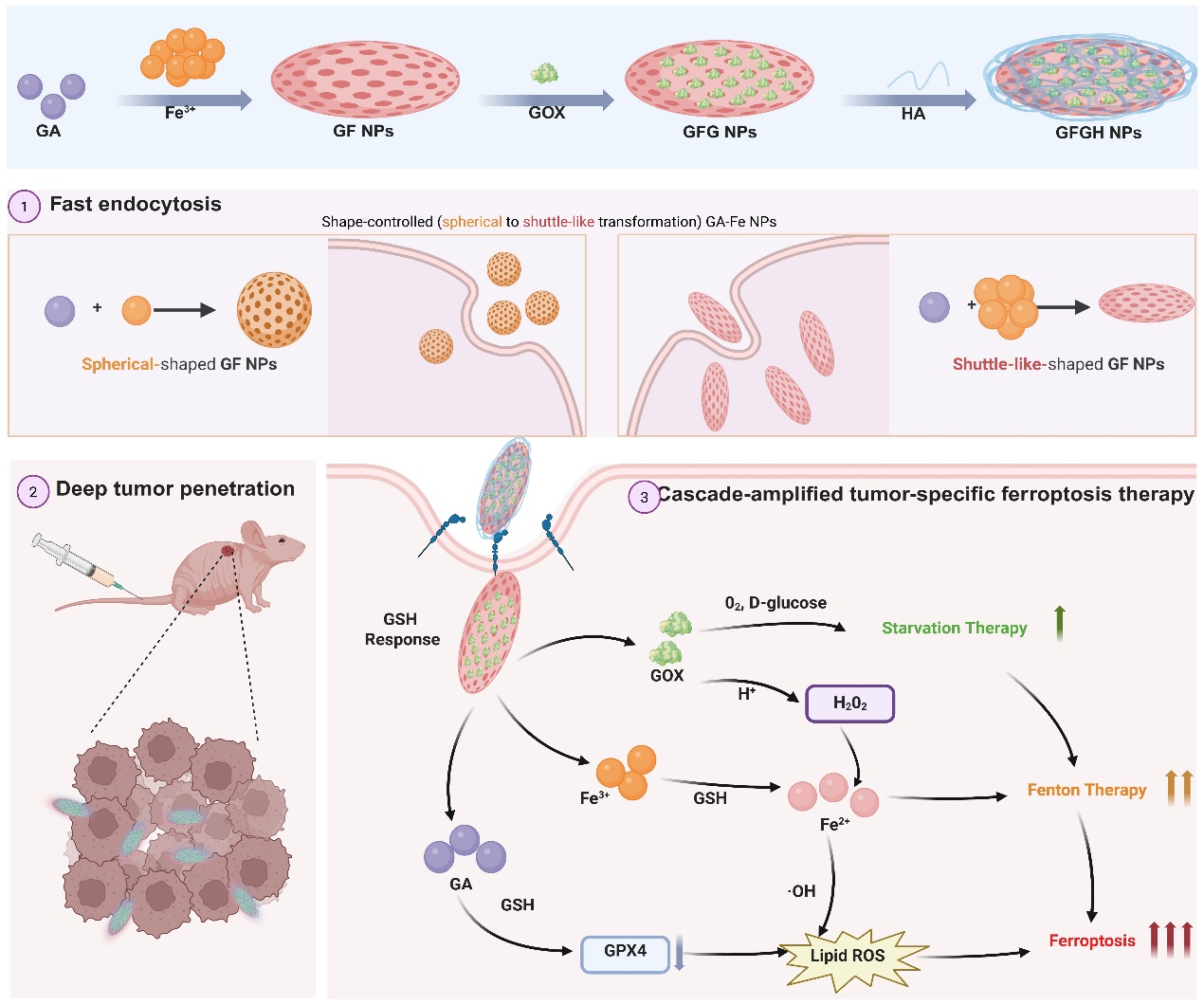 该纳米递药系统巧妙地利用了藤黄酸与铁离子的配位作用,成功构建了形状可控(球形-梭形)的GF NPs;并进一步装载葡萄糖氧化酶(GOX)及修饰透明质酸(HA)最终形成GFGH NPs。GFGH NPs独特的梭形形态使其能高效地穿透肿瘤组织并被癌细胞大量摄取。进入细胞后,GFGH NPs在肿瘤细胞内高浓度的GSH环境中迅速响应,裂解释放出藤黄酸、亚铁离子(铁离子还原)和GOX。三者协同作用,形成强大的“组合拳”:(1)GOX通过消耗葡萄糖产生饥饿疗法效果,同时提供酸性环境和H2O2;(2)亚铁离子在酸性环境下通过Fenton反应,将H2O2转化为大量杀伤性的羟基自由基;(3)藤黄酸进一步消耗细胞内GSH,并下调铁死亡关键蛋白谷胱甘肽过氧化物酶4(GPX4);最终共同导致脂质过氧化物无法被及时清除而大量堆积,最终高效诱导细胞铁死亡。