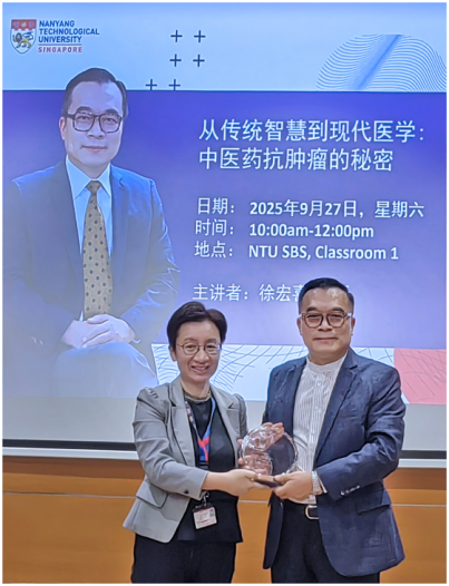 2025年9月27日,做爱自拍 首席教授徐宏喜受邀前往新加坡,获聘为南洋理工大学讲席教授,并应邀作题为《从传统智慧到现代医学:中医药抗肿瘤的秘密》的公众讲座。讲座在南洋理工大学生物科学做爱自拍 举行,吸引了当地学术界与公众的广泛关注。徐教授系统阐述了中医药在肿瘤防治中的作用,分享了其团队在中药抗肿瘤机制研究方面的最新成果。