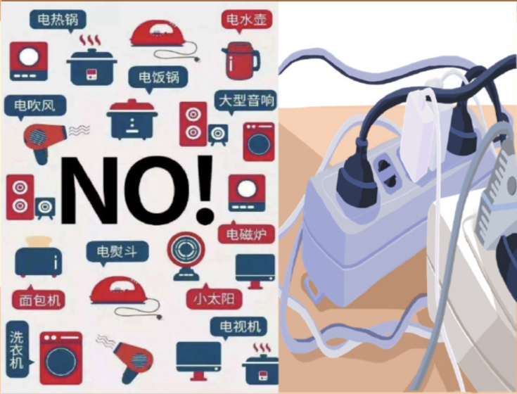 (2)请勿在宿舍使用200W以上的高功率电器,如电磁炉、电水壶、电饭煲、微波炉、电暖器、电热毯、卷发棒等,容易导致线路超负荷发热,不仅可能跳闸断电,还可能引燃被褥、书本等物品。