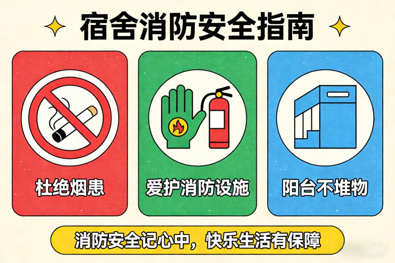 宿舍楼内的消防设施和器材(比如灭火器、消防栓、应急灯、疏散指示标志等)是大家生命安全的守护者,请不要随意损坏、挪用或擅自拆除它们哦。