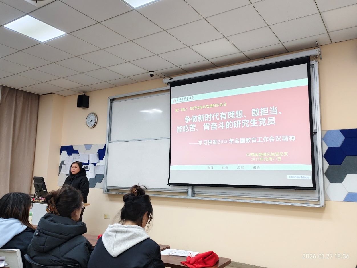 随后,各研究生党支部书记依次进行述职汇报。研究生第一党支部书记马美琳以《衔接研序强党建,服务攻坚促成长》为主题,汇报了支部在党建融入科研培养全过程中的实践经验;研究生第二党支部书记普青以《传承杏林担使命,奋楫笃行谱新篇》为题,重点介绍了支部在理论学习与中医药文化传承中的特色做法;研究生第三党支部书记李乔睿围绕《党建引领科研路,岐黄薪火建新功》,总结了支部以党建促科研、以科研强担当的探索路径。